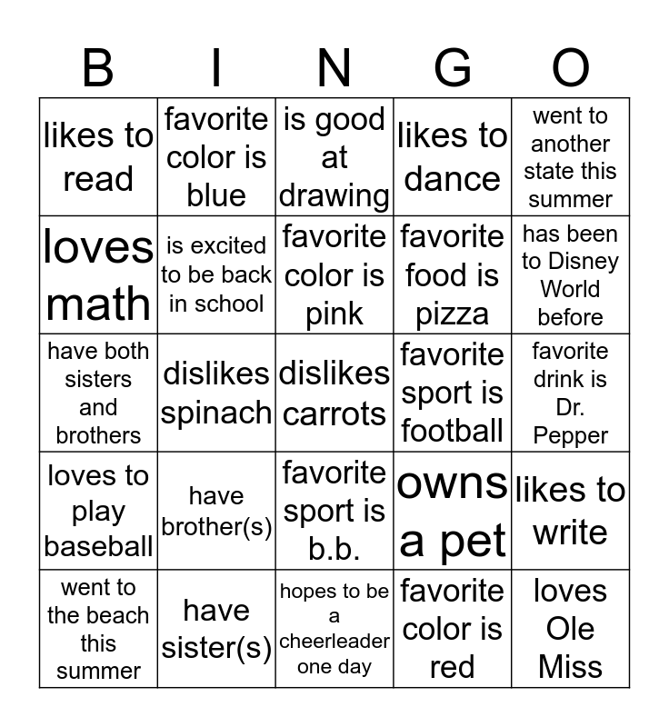 This bingo card has a free space and 24 words: have brother(s), have sister(s), favorite color is pink, went to the beach this summer, went to another state this summer, likes to read, loves math, favorite color is blue, favorite sport is football, favorite sport is b.b., favorite food is pizza, have both sisters and brothers, owns a pet, likes to write, is excited to be back in school, favorite color is red, favorite drink is Dr. Pepper, is good at drawing, has been to Disney World before, dislikes spinach, loves Ole Miss, loves to play baseball, likes to dance and hopes to be a cheerleader one day.