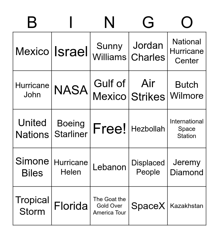 This bingo card has a free space and 24 words: Hurricane Helen, Florida, Gulf of Mexico, Tropical Storm, National Hurricane Center, Mexico, Hurricane John, Israel, Hezbollah, Lebanon, Air Strikes, United Nations, Displaced People, Jeremy Diamond, NASA, SpaceX, International Space Station, Sunny Williams, Butch Wilmore, Boeing Starliner, Kazakhstan, Simone Biles, Jordan Charles and The Goat the Gold Over America Tour.