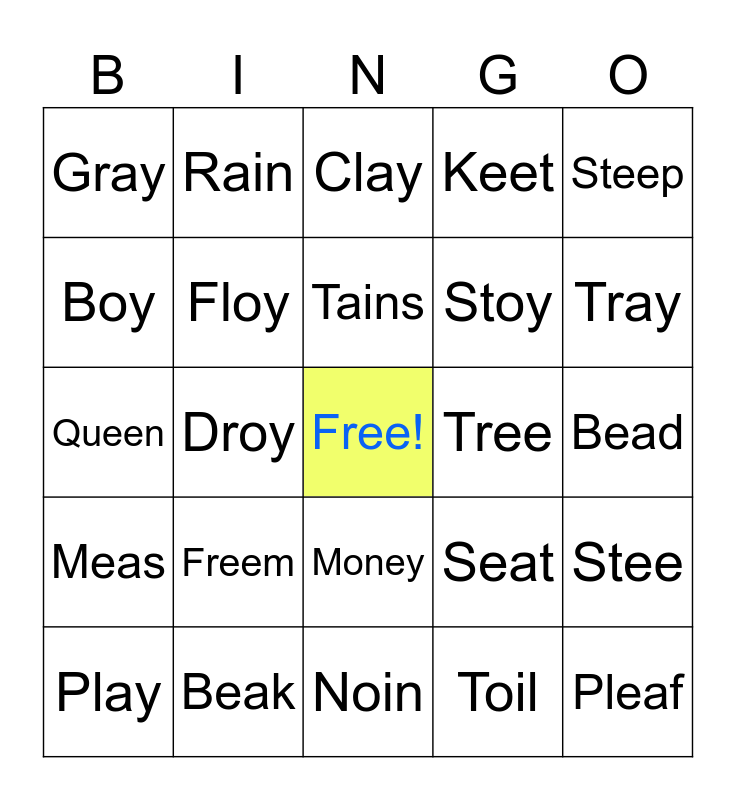 This bingo card has a free space and 34 words: Team, Toil, Keys, Choip, Meas, Floy, Steep, Play, Rain, Maip, Tains, Clay, Gains, Roy, Tree, Tray, Beak, Queen, Freem, Seat, Money, Toil, Gray, Bead, Noin, Pleaf, Keet, Honey, Stoy, Boy, Join, Droy, Stee and Glay.