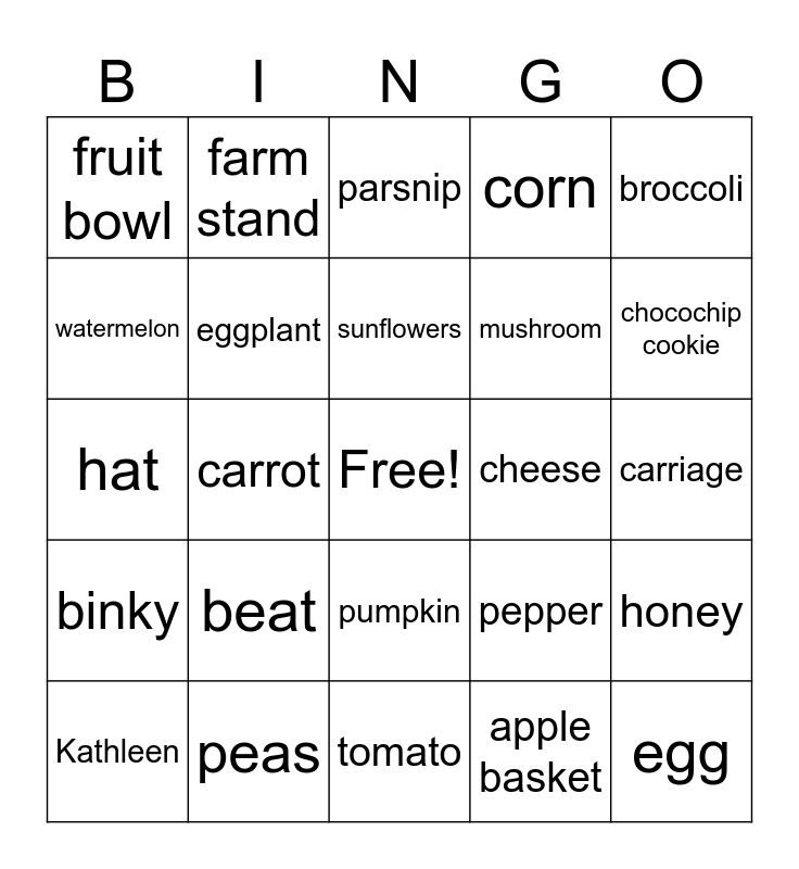 This bingo card has a free space and 50 words: milk, egg, fruit box, tomato, beat, flower pot, farm stand, Strawberry, watermelon, cherry, eggplant, corn, honey, pepper, olive oil, cabbage, sunflowers, cheese, avocado, broccoli, carrot, apple basket, fruit bowl, mushroom, bread, grape, chocochip cookie, cupcake, parsnip, pumpkin, cauliflower, baggy, mason jar, watering pot, peas, tote bag, produce weight, nuts, flower truck, carriage, baggate, herbs, asparagus, onesie, Kathleen, hat, rattle, dream catcher, binky and baby blocks.