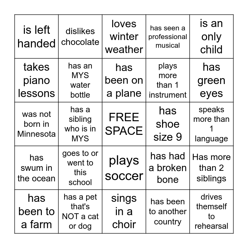 This bingo card has a free space and 24 words: goes to or went to this school, has a pet that's NOT a cat or dog, has been on a plane, has been to a farm, is an only child, is left handed, takes piano lessons, dislikes chocolate, has shoe size 9, plays soccer, plays more than 1 instrument, was not born in Minnesota, has had a broken bone, Has more than 2 siblings, has an MYS water bottle, has been to another country, speaks more than 1 language, loves winter weather, has green eyes, has a sibling who is in MYS, drives themself to rehearsal, has swum in the ocean, has seen a professional musical and sings in a choir.