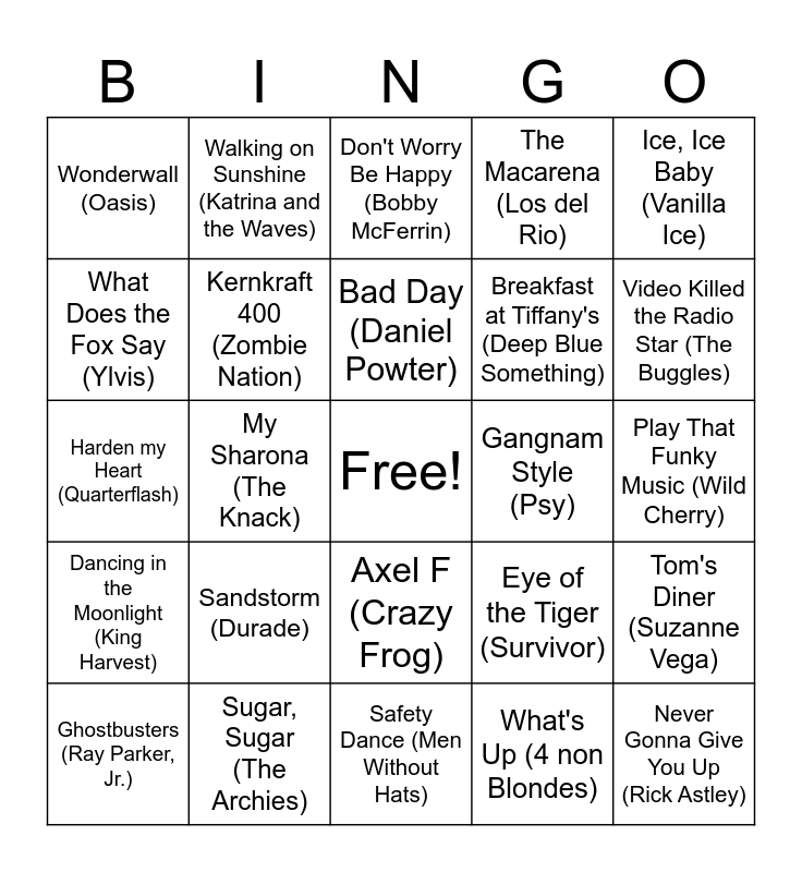 This bingo card has a free space and 45 words: Never Gonna Give You Up (Risk Astley), Never Gonna Give You Up (Rick Astley), Funky Town (Lipps Inc), Ghostbusters (Ray Parker, Jr.), Achy Breaky Heart (Billy Ray Cyrus), What's Up (4 non Blondes), Don't Worry Be Happy (Bobby McFerrin), 500 Miles (The Proclaimers, Ice, Ice Baby (Vanilla Ice), Sugar, Sugar (The Archies), The Macarena (Los del Rio), Gangnam Style (Psy), Axel F (Crazy Frog), Sandstorm (Durade), MMMbop (Hanson), Safety Dance (Men Without Hats), Hey, Mickey (Toni Basil), Harden my Heart (Quarterflash), Who Let the Dogs Out (Baha Men), Video Killed the Radio Star (The Buggles), Walking on Sunshine (Katrina and the Waves), Werewolves of London (Warren Zevon), Mambo no.5 (Lou Bega), Wonderwall (Oasis), Dance Monkey (The Tones and I), Play That Funky Music (Wild Cherry), Whip It (Devo), Somebody that I used to Know (Gotye), Eye of the Tiger (Survivor), Dancing in the Moonlight (King Harvest), It's Raining Men (The Weather Girls), Tom's Diner (Suzanne Vega), Tubthumping (Chubawumba), Hooked on a Feeling (Blue Swede), What;s Up (4 non blondes), My Sharona (The Knack), Take on Me (a-ha), A Thousand Miles (Vanessa Carlton), Sandstorm (Durade), Bad Day (Daniel Powter), What Does the Fox Say (Ylvis), Breakfast at Tiffany's (Deep Blue Something), Kung Fu Fighting (Carl Douglas), Kernkraft 400 (Zombie Nation) and Riptide (Vance Joy).