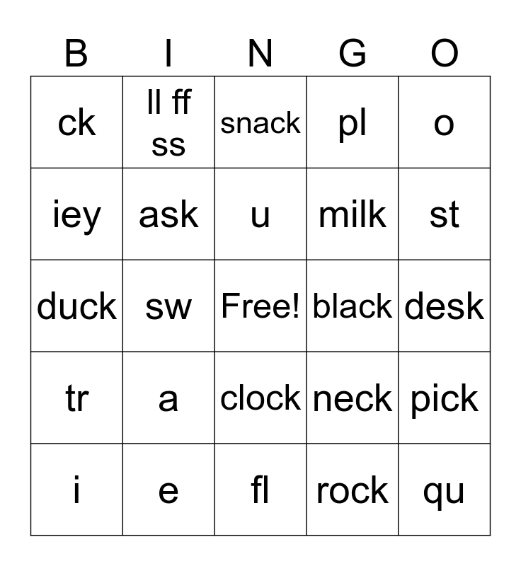 This bingo card has a free space and 24 words: a, e, u, i, o, ck, iey, ll ff ss, black, clock, milk, duck, neck, pick, ask, rock, desk, snack, st, sw, qu, tr, pl and fl.