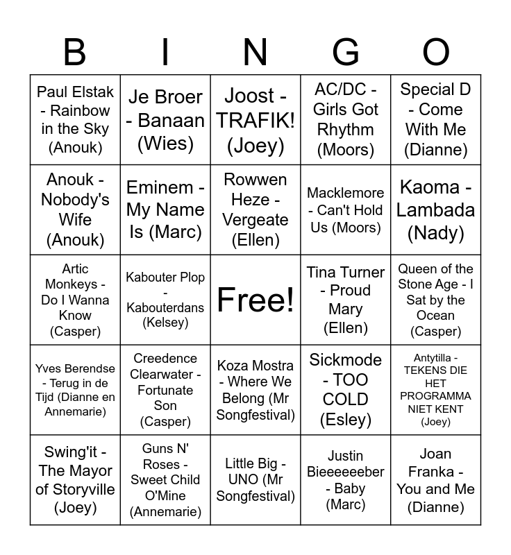 This bingo card has a free space and 60 words: Van Halen - Panama (Annemarie), Guns N' Roses - Sweet Child O'Mine (Annemarie), Enrique Iglesias - Bailando (Annemarie), Yves Berendse - Terug in de Tijd (Dianne en Annemarie), Justin Bieeeeeeber - Baby (Marc), Sean Paul - Get Busy (Marc), Eminem - My Name Is (Marc), S10 - De Diepte (Marc), Macklemore - Can't Hold Us (Moors), Elton John - I'm Still Standing (Moors), AC/DC - Girls Got Rhythm (Moors), D-Sturb - Nothing Like The Oldschool (Moors), Anouk - Nobody's Wife (Anouk), SNAP! - Rhythm is a Dancer (Anouk), Fugees - Ready or Not (Anouk), Paul Elstak - Rainbow in the Sky (Anouk), Joan Franka - You and Me (Dianne), Special D - Come With Me (Dianne), Snelle - Ruggengraat (Dianne), Rowwen Heze - Vergeate (Ellen), Tina Turner - Proud Mary (Ellen), Joost - TRAFIK! (Joey), Swing'it - The Mayor of Storyville (Joey), Antytilla - TEKENS DIE HET PROGRAMMA NIET KENT (Joey), Truslow - Words of the Wise (Joey), The Opposites - Hey DJ (Ellen), De Jeugd van Tegenwoordig - De Formule (Ellen), Dune - Hardcore Vibes (Nady), Kaoma - Lambada (Nady), Party Animals - Hava Naquila (Nady), Cyndi Lauper - Girls Just Want to Have Fun (Nady), Technohead - I Wanne be a Hippy (Wies), Rammstein - Dicke Titten (Wies), De Jeugd van Tegenwoordig - Watskeburt (Wies), Je Broer - Banaan (Wies), Juf Roos - In de Manenschijn (Kelsey), Kinderen voor Kinderen - Help (ik weet niet waar m'n schoenen zijn) (Kelsey), Kabouter Plop - Kabouterdans (Kelsey), Klein Orkest - Leuk is Raar (Kelsey), Artic Monkeys - Do I Wanna Know (Casper), Ms Lauryn Hill - Everything is Everything (Casper), Creedence Clearwater - Fortunate Son (Casper), Queen of the Stone Age - I Sat by the Ocean (Casper), Frans Bauwer - Van Brabant naar Bordeaux (Esley), Sickmode - TOO COLD (Esley), k3 - Oya Lele (Esley), Big Time Rush - Paralyzed (Esley), Go-a - SHUM (Mr Songfestival), Maneskin - ZITTI E BUONI (Mr Songfestival), Koza Mostra - Where We Belong (Mr Songfestival), Little Big - UNO (Mr Songfestival), Serhat - Say NA NA NA (Mr Songfestival), Netta - Toy (Mr Songfestival), Sunstroke Project - Run Away (Mr Songfestival), Athena - For Real (Mr Songfestival), Loreen - Euphoria (Mr Songfestival), Subwoolfer - Gife that Wolf a Banana (Mr Songfestival), Zdob si Zdub - Trenuletul (Mr Songfestival), Citi Zeni - Eat your Salad (Mr Songfestival) and Sam Ryder - SPACE MAN (Mr Songfestival).