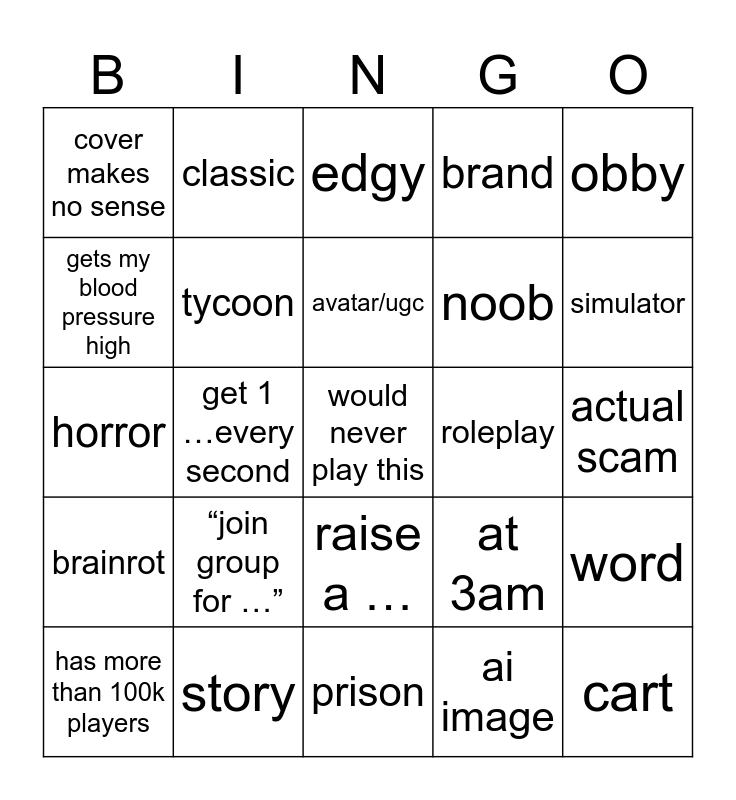 This bingo card has a free space and 34 words: ice spice, ai image, game i actually like, pay to win, brainrot, tycoon, obby, has more than 100k players, classic, “freaky”, avatar/ugc, edgy, drake, ripoff or copyrighted, roleplay, simulator, story, horror, “join group for …”, at 3am, raise a …, find the …, cover makes no sense, actual scam, prison, cart, brand, hand-drawn cover, noob, gets my blood pressure high, competitive, get 1 …every second, word and hide and seek.