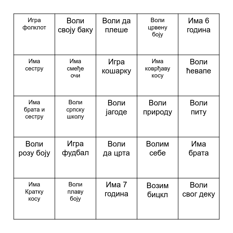 This bingo card has 25 words: Игра фудбал, Има 7 година, Игра кошарку, Има Кратку косу, Има 6 година, Игра фолклот, Има сестру, Воли своју баку, Воли природу, Воли да црта, Има коврђаву косу, Има брата и сестру, Волим себе, Има брата, Има смеђе очи, Воли свог деку, Воли питу, Воли да плеше, Воли ћевапе, Воли српску школу, Воли јагоде, Воли плаву боју, Воли розу боју, Воли црвену боју and Возим бицкл.