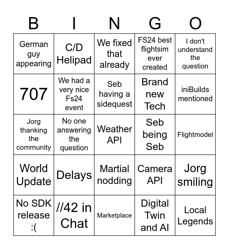 This bingo card has a free space and 24 words: Delays, //42 in Chat, Seb having a sidequest, No SDK release :(, I don't understand the question, German guy appearing, 707, C/D Helipad, Seb being Seb, Martial nodding, Brand new Tech, Jorg thanking the community, Camera API, Jorg smiling, We had a very nice Fs24 event, Digital Twin and AI, Flightmodel, We fixed that already, iniBuilds mentioned, No one answering the question, Local Legends, World Update, FS24 best flightsim ever created and Marketplace.