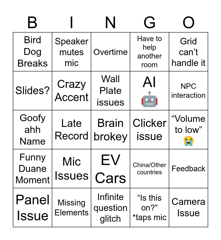This bingo card has a free space and 24 words: Mic Issues, Missing Elements, Wall Plate issues, Panel Issue, Grid can’t handle it, Bird Dog Breaks, Slides?, Speaker mutes mic, Clicker issue, EV Cars, AI 🤖, Goofy ahh Name, China/Other countries, Feedback, Crazy Accent, “Is this on?” *taps mic, “Volume to low” 😭, Overtime, NPC interaction, Late Record, Camera Issue, Funny Duane Moment, Have to help another room and Infinite question glitch.