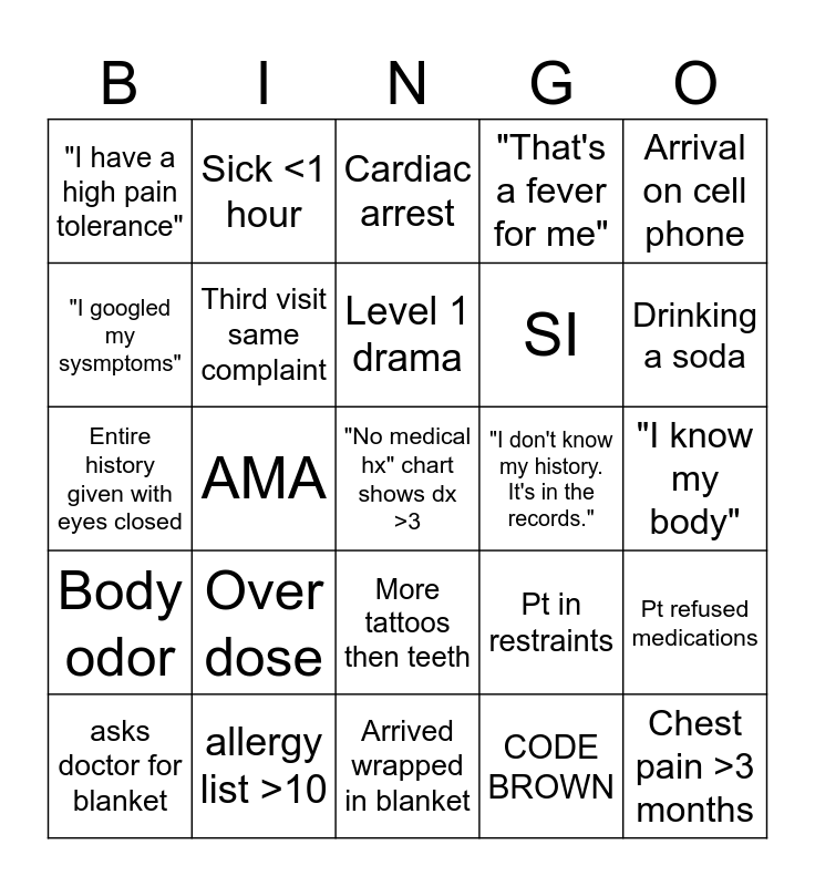 This bingo card has a free space and 24 words: Over dose, allergy list >10, Level 1 drama, asks doctor for blanket, Arrival on cell phone, "I have a high pain tolerance", "I googled my sysmptoms", Sick <1 hour, "I don't know my history. It's in the records.", More tattoos then teeth, SI, Entire history given with eyes closed, Pt in restraints, Pt refused medications, Third visit same complaint, CODE BROWN, "I know my body", Cardiac arrest, Drinking a soda, AMA, Chest pain >3 months, Body odor, "That's a fever for me" and Arrived wrapped in blanket.