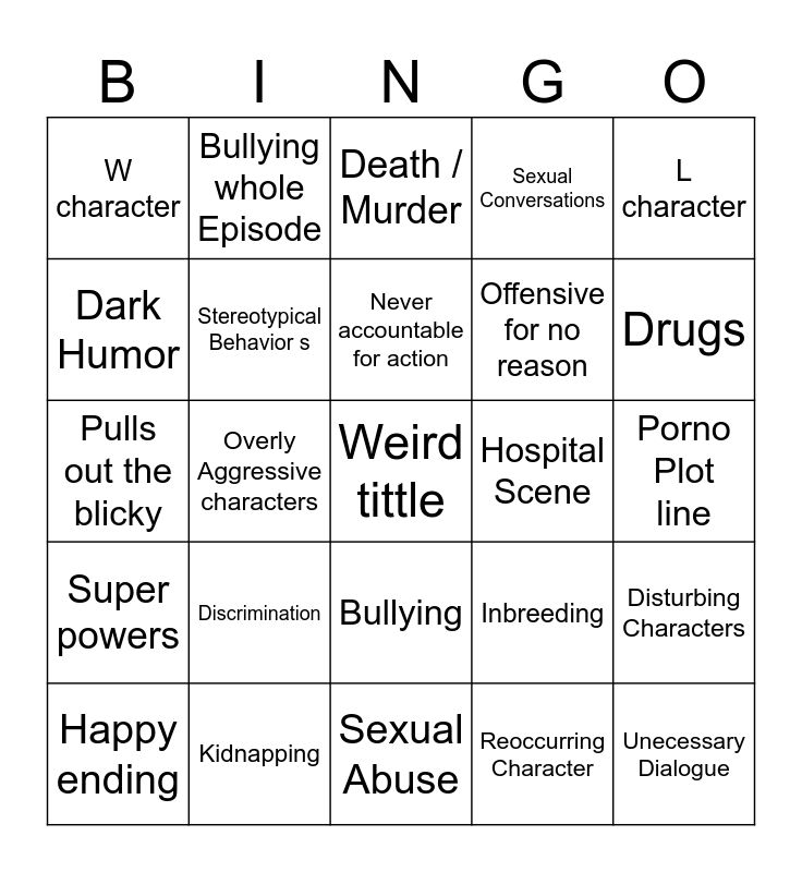 This bingo card has a free space and 24 words: Discrimination, Kidnapping, Never accountable for action, Happy ending, L character, W character, Dark Humor, Bullying whole Episode, Hospital Scene, Bullying, Offensive for no reason, Pulls out the blicky, Inbreeding, Disturbing Characters, Stereotypical Behavior s, Reoccurring Character, Porno Plot line, Death / Murder, Drugs, Overly Aggressive characters, Unecessary Dialogue, Super powers, Sexual Conversations and Sexual Abuse.