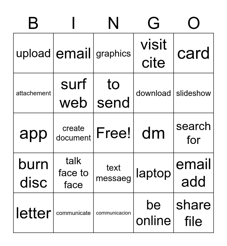 This bingo card has a free space and 24 words: talk face to face, communicate, to send, letter, card, upload, attachement, email, dm, text messaeg, download, app, laptop, email add, surf web, be online, search for, graphics, slideshow, create document, share file, burn disc, visit cite and communicacion.