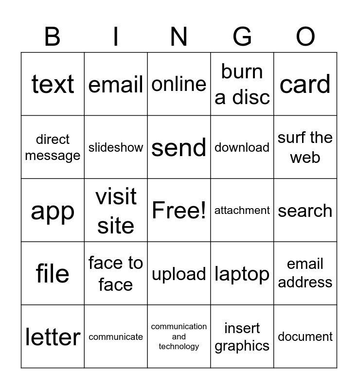 This bingo card has a free space and 24 words: face to face, communicate, send, letter, card, text, direct message, email, attachment, upload, download, app, laptop, email address, slideshow, insert graphics, search, online, surf the web, visit site, document, file, burn a disc and communication and technology.