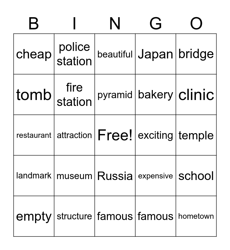 This bingo card has a free space and 56 words: small, empty, quite, cheap, famous, shop, fire station, modern, bakery, boring, Japan, traditional, drugstore, statue, urban, library, bridge, attraction, pet shop, hometown, exciting, hospital, expensive, beautiful, country, pyramid, city, bookstore, clinic, large, building, post office, countryside, noisy, temple, tomb, restaurant, shoe store, landmark, police station, Russia, tower, mall, crowded, gas station, museum, structure, Café, location, shoe store, famous, lovely, China, Rome, school and butcher's.