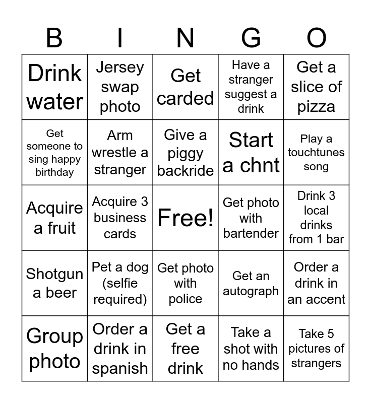 This bingo card has a free space and 24 words: Pet a dog (selfie required), Order a drink in spanish, Give a piggy backride, Group photo, Get a slice of pizza, Drink water, Get someone to sing happy birthday, Jersey swap photo, Get photo with bartender, Get photo with police, Start a chnt, Acquire a fruit, Get an autograph, Order a drink in an accent, Arm wrestle a stranger, Take a shot with no hands, Drink 3 local drinks from 1 bar, Get carded, Play a touchtunes song, Acquire 3 business cards, Take 5 pictures of strangers, Shotgun a beer, Have a stranger suggest a drink and Get a free drink.