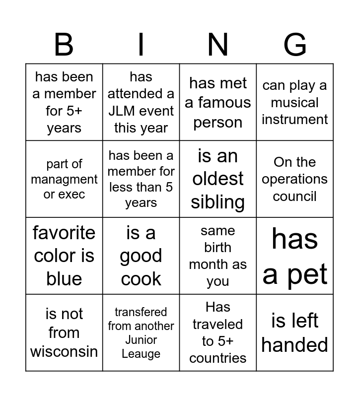 This bingo card has 24 words: On the communicity council, On the communications council, On the operations council, On the membership council, part of managment or exec, has been a member for 5+ years, has been a member for less than 5 years, has attended a JLM event this year, transfered from another Junior Leauge, Speak to someone you don't know, favorite color is blue, same birth month as you, knows a second language, is a youngest sibling, is an oldest sibling, has never broken a bone, Has traveled to 5+ countries, has met a famous person, is a good cook, has a pet, is not from wisconsin, is left handed, can play a musical instrument and excited for the league year.