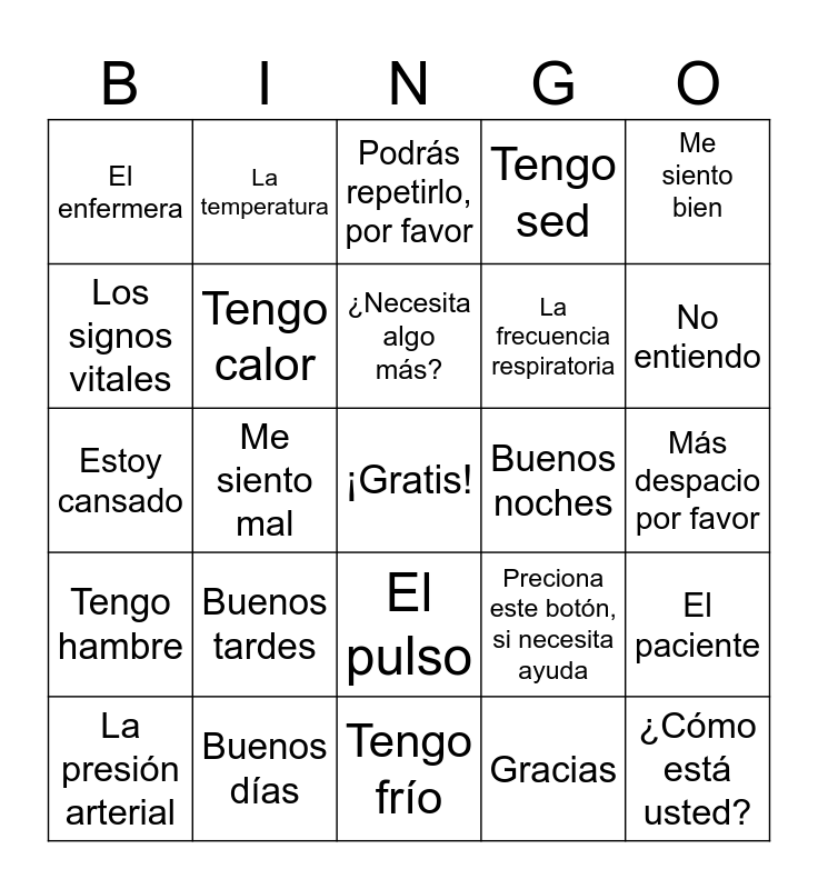 This bingo card has a free space and 24 words: Buenos tardes, Buenos días, ¿Necesita algo más?, La presión arterial, Me siento bien, El enfermera, Los signos vitales, La temperatura, Buenos noches, El pulso, La frecuencia respiratoria, Estoy cansado, Preciona este botón, si necesita ayuda, El paciente, Tengo calor, Gracias, Más despacio por favor, Podrás repetirlo, por favor, No entiendo, Me siento mal, ¿Cómo está usted?, Tengo hambre, Tengo sed and Tengo frío.