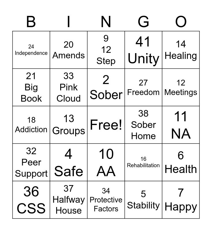 This bingo card has a free space and 42 words: 1 Recovery, 2 Sober, 3 Clean, 4 Safe, 5 Stability, 6 Health, 7 Happy, 8 Harm Reduction, 9 12 Step, 10 AA, 11 NA, 12 Meetings, 13 Groups, 14 Healing, 15 Cure, 16 Rehabilitation, 17 Betterment, 18 Addiction, 19 Addict, 20 Amends, 21 Big Book, 22 Carry the Message, 23 Coping Skills, 24 Independence, 25 NARCAN, 26 Family, 27 Freedom, 28 Holistic, 29 Inventory, 30 MATs, 31 Outpatient Treatment, 32 Peer Support, 33 Pink Cloud, 34 Protective Factors, 35 Detox, 36 CSS, 37 Halfway House, 38 Sober Home, 39 Residential Treatment, 40 Community, 41 Unity and 42 Service.