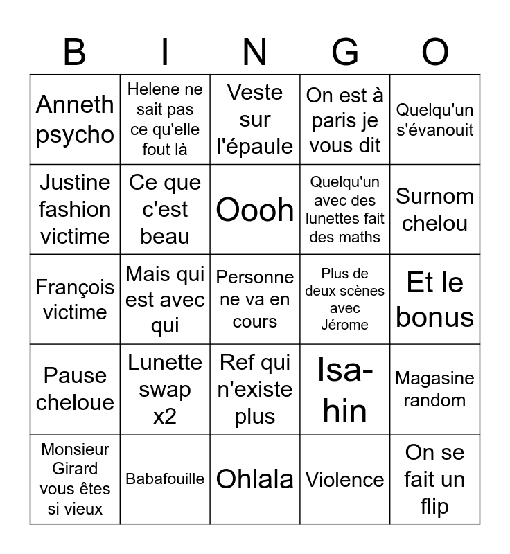 This bingo card has 25 words: Lunette swap x2, Ohlala, Oooh, Monsieur Girard vous êtes si vieux, Quelqu'un s'évanouit, Anneth psycho, Justine fashion victime, Helene ne sait pas ce qu'elle fout là, Plus de deux scènes avec Jérome, Ref qui n'existe plus, Quelqu'un avec des lunettes fait des maths, François victime, Isa-hin, Magasine random, Ce que c'est beau, On se fait un flip, Et le bonus, Veste sur l'épaule, Surnom chelou, Mais qui est avec qui, Personne ne va en cours, Babafouille, Pause cheloue, On est à paris je vous dit and Violence.