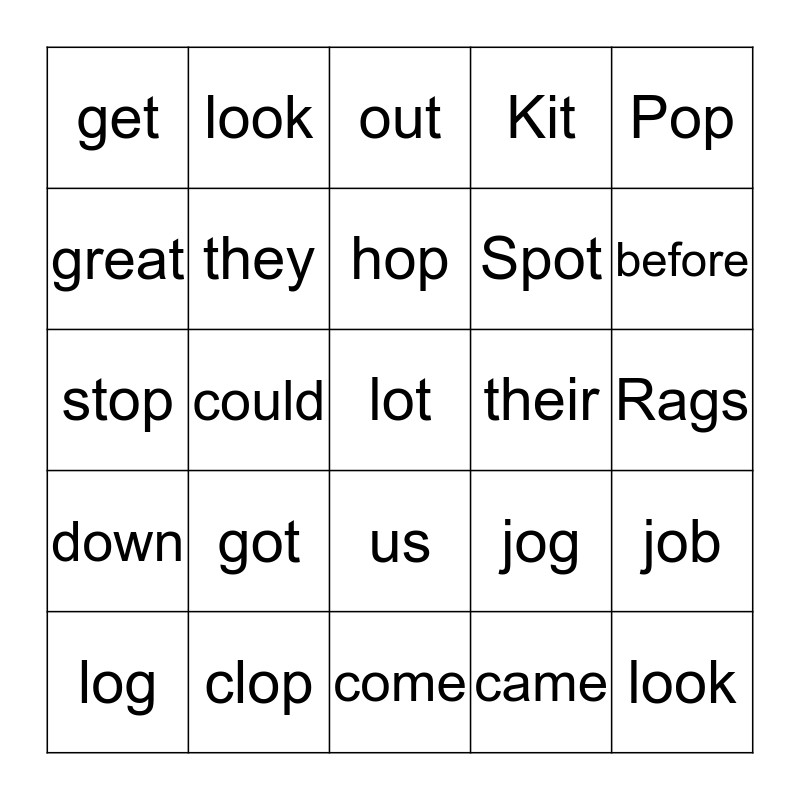 This bingo card has a free space and 24 words: got, clop, hop, log, Pop, get, great, look, their, us, Spot, stop, jog, job, they, came, Rags, out, before, could, look, down, Kit and come.