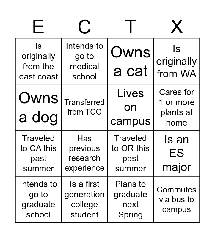 This bingo card has 20 words: Is an ES major, Is a Biomed major, Owns a cat, Traveled internationally this past summer, Intends to go to graduate school, Owns a dog, Is a first generation college student, Is originally from the east coast, Traveled to CA this past summer, Intends to go to medical school, Has previous research experience, Traveled to OR this past summer, Transferred from TCC, Commutes via bus to campus, Lives on campus, Volunteers for a local organization, Cares for 1 or more plants at home, Is originally from WA, Plans to graduate next Spring and Has completed their capstone.
