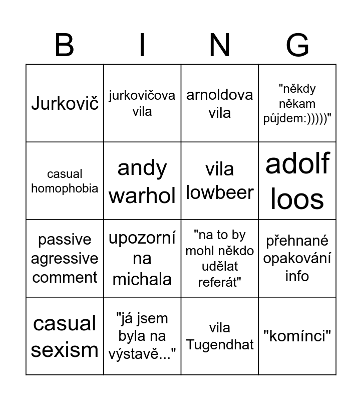This bingo card has 17 words: vila Tugendhat, casual sexism, arnoldova vila, Jurkovič, upozorní na michala, "někdy někam půjdem:)))))", přehnané opakování info, vila lowbeer, adolf loos, andy warhol, "já jsem byla na výstavě...", "na to by mohl někdo udělat referát", casual homophobia, jurkovičova vila, passive agressive comment, "měl bys to vystínovat" and "komínci".