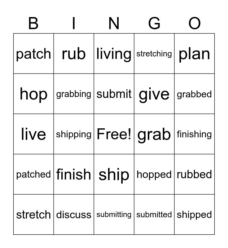 This bingo card has a free space and 24 words: finish, discuss, submit, stretch, plan, patch, hop, rub, grab, ship, give, live, hopped, rubbed, grabbing, submitted, finishing, living, grabbed, shipping, shipped, patched, stretching and submitting.