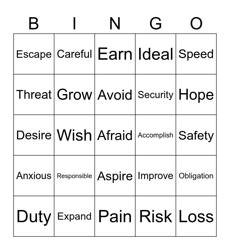 This bingo card has a free space and 24 words: Responsible, Expand, Avoid, Duty, Speed, Escape, Threat, Careful, Accomplish, Aspire, Security, Desire, Improve, Obligation, Grow, Risk, Safety, Earn, Hope, Wish, Loss, Anxious, Ideal and Pain.