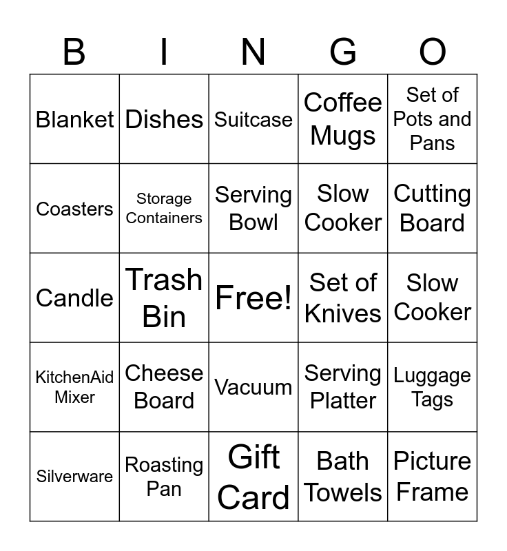 This bingo card has a free space and 34 words: Bed Sheets, Bath Towels, Baking Pans, Coffee Maker, KitchenAid Mixer, Storage Containers, Set of Pots and Pans, Silverware, Dishes, Baking Sheets, Serving Bowl, Suitcase, Cooking Utensils, Glass Pitcher, Set of Knives, Cutting Board, Roasting Pan, Candle, Cheese Board, Serving Platter, Vacuum, Toaster, Blanket, Slow Cooker, Gift Card, Picture Frame, Coffee Mugs, Pot Holders, Slow Cooker, Coasters, Salad Spinner, Trash Bin, Luggage Tags and Kitchen Towls.