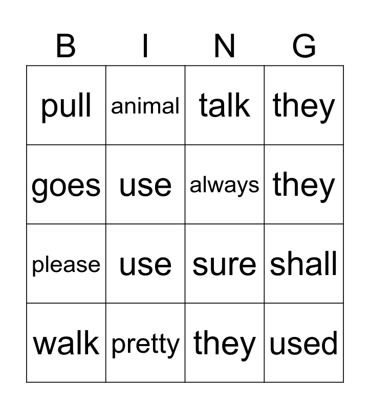 This bingo card has 20 words: shall, both, talk, done, walk, goes, pretty, pull, please, animal, use, sure, use, used, always, never, they, they, they and they.