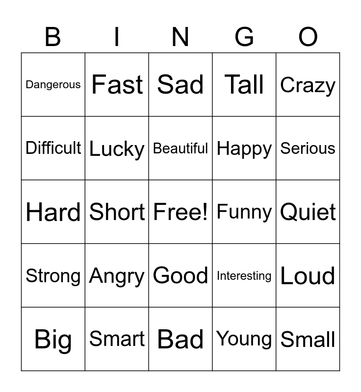 This bingo card has a free space and 25 words: Angry, Bad, Beautiful, Big, Crazy, Dangerous, Difficult, Fast, Funny, Good, Happy, Hard, Interesting, Loud, Lucky, Old, Quiet, Sad, Serious, Short, Small, Smart, Strong, Tall and Young.