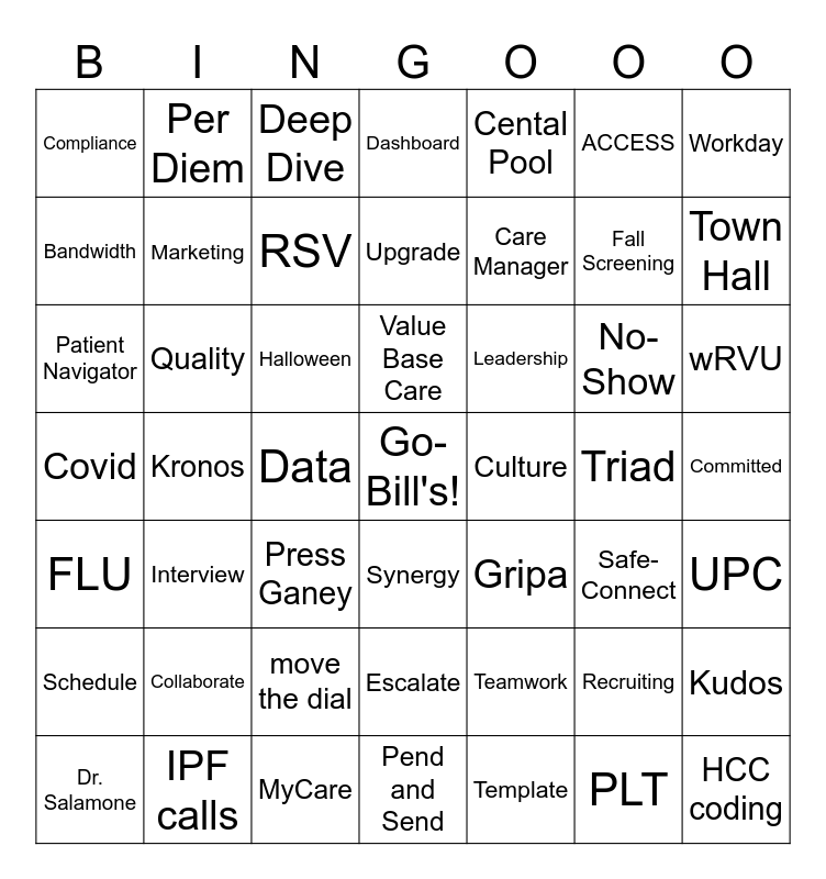 This bingo card has 56 words: Dr. Salamone, Kronos, MyCare, Dashboard, Culture, Recruiting, Workday, Express Care, Per Diem, Press Ganey, Upgrade, Gripa, Safe-Connect, UPC, Schedule, Collaborate, RSV, Value Base Care, Metrics, ACCESS, Town Hall, Covid, Quality, Deep Dive, Monroe East, Care Manager, Triad, HCC coding, Bandwidth, IPF calls, Budget, Escalate, Teamwork, PLT, wRVU, Compliance, Marketing, Data, Go- Bill's!, Cental Pool, Fall Screening, Committed, FLU, Care Connect, move the dial, Synergy, Leadership, HLC's, Kudos, Patient Navigator, Interview, Halloween, Pend and Send, Template, No-Show and Uplift.