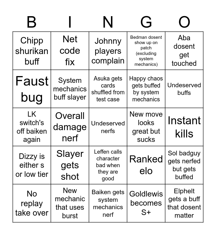 This bingo card has a free space and 24 words: Slayer gets shot, New mechanic that uses burst, Asuka gets cards shuffled from test case, No replay take over, Aba dosent get touched, Chipp shurikan buff, Faust bug, Net code fix, New move looks great but sucks, Leffen calls character bad when they are good, Happy chaos gets buffed by system mechanics, LK switch's off baiken again, Ranked elo, Sol badguy gets nerfed but gets buffed, System mechanics buff slayer, Goldlewis becomes S+, Instant kills, Johnny players complain, Undeserved buffs, Overall damage nerf, Elphelt gets a buff that dosent matter, Dizzy is either s or low tier, Bedman dosent show up on patch (excluding system mechanics) and Baiken gets system mechanics nerf.