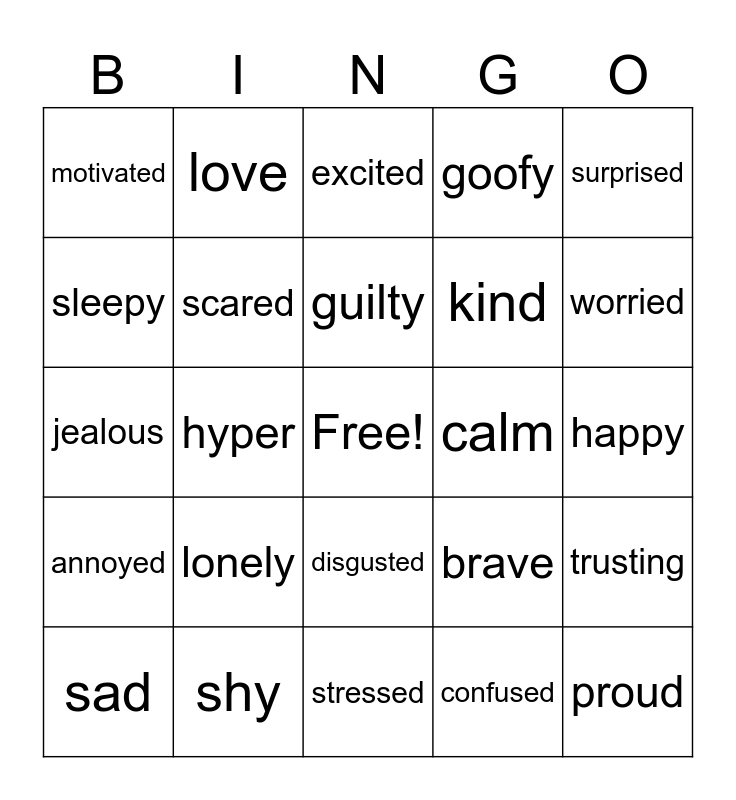 This bingo card has a free space and 29 words: sad, bored, hyper, confident, motivated, excited, scared, lonely, calm, shy, happy, proud, stressed, confused, worried, angry, disgusted, annoyed, surprised, jealous, brave, relaxed, kind, sleepy, goofy, love, trusting, guilty and offended.