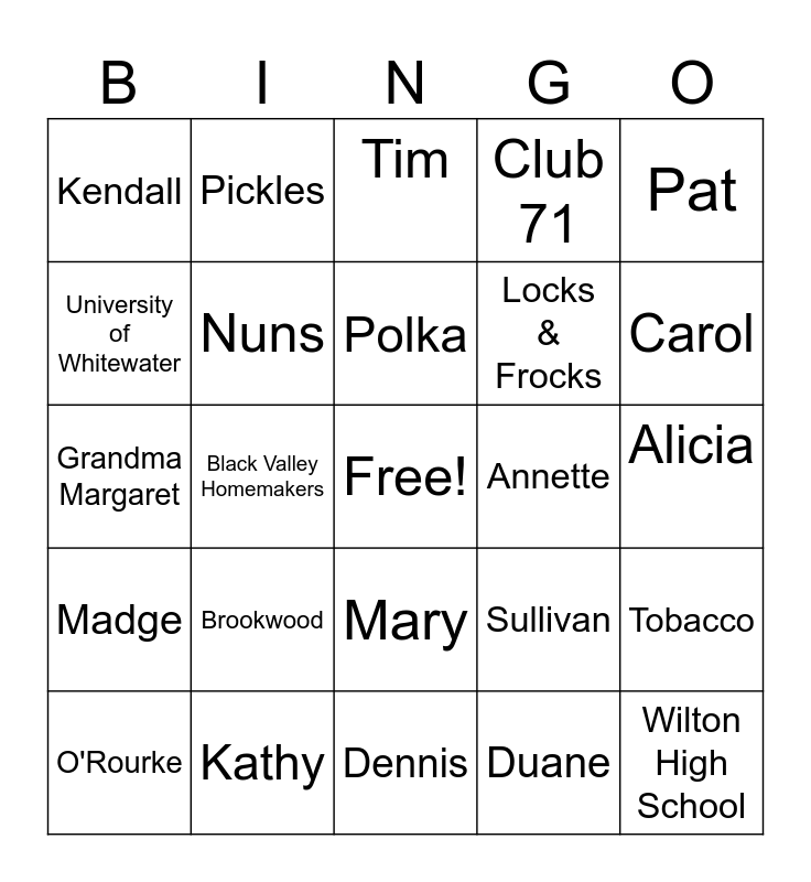 This bingo card has a free space and 29 words: O'Rourke, Jim, Black Valley Homemakers, Grandpa Ed, Kendall, Tim, Nuns, Brookwood, Annette, Kathy, Alicia, Wilton High School, Dennis, Duane, Carol, St. Mary's Ridge, Mary, Madge, Pat, Grandma Margaret, Sullivan, Mike, Locks & Frocks, University of Whitewater, Club 71, Pickles, Tobacco, Polka and Barbara Jo.