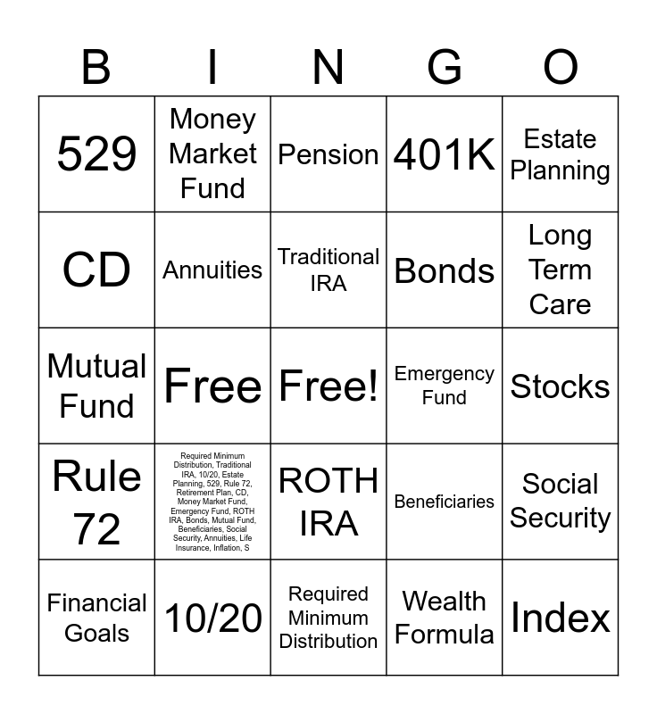 This bingo card has a free space and 25 words: Required Minimum Distribution, Traditional IRA, 10/20, Estate Planning, 529, Rule 72, Retirement Plan, CD, Money Market Fund, Emergency Fund, ROTH IRA, Bonds, Mutual Fund, Beneficiaries, Social Security, Annuities, Life Insurance, Inflation, S, Required Minimum Distribution, Traditional IRA, Financial Goals, Estate Planning, 529, CD, Money Market Fund, Emergency Fund, ROTH IRA, Bonds, Mutual Fund, Beneficiaries, Social Security, Annuities, Life Insurance, Stocks, Pension, Long Term Care, Free, Index, 10/20, Rule 72, 401K and Wealth Formula.