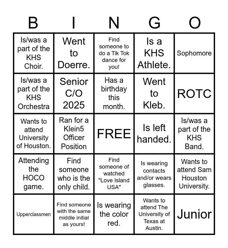 This bingo card has a free space and 24 words: Upperclassmen, Find someone who is the only child., Has a birthday this month., Wants to attend The University of Texas at Austin., Sophomore, Is/was a part of the KHS Choir., Went to Doerre., Find someone to do a Tik Tok dance for you!, Is left handed., Is/was a part of the KHS Band., Wants to attend University of Houston., Senior C/O 2025, Is wearing contacts and/or wears glasses., Wants to attend Sam Houston University., Is/was a part of the KHS Orchestra, Find someone with the same middle initial as yours!, Is wearing the color red., Is a KHS Athlete., ROTC, Attending the HOCO game., Ran for a Klein5 Officer Position, Find someone of watched "Love Island USA", Went to Kleb. and Junior.
