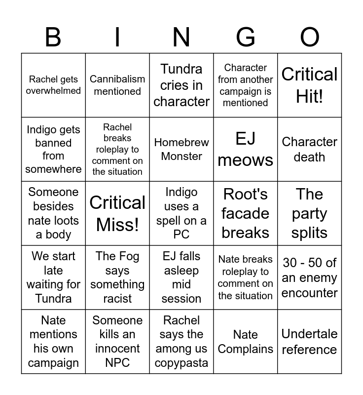 This bingo card has a free space and 24 words: The Fog says something racist, Someone kills an innocent NPC, Homebrew Monster, Nate mentions his own campaign, Critical Hit!, Rachel gets overwhelmed, Indigo gets banned from somewhere, Cannibalism mentioned, Root's facade breaks, EJ falls asleep mid session, EJ meows, Someone besides nate loots a body, Nate breaks roleplay to comment on the situation, 30 - 50 of an enemy encounter, Rachel breaks roleplay to comment on the situation, Nate Complains, The party splits, Tundra cries in character, Character death, Critical Miss!, Undertale reference, We start late waiting for Tundra, Character from another campaign is mentioned and Rachel says the among us copypasta.