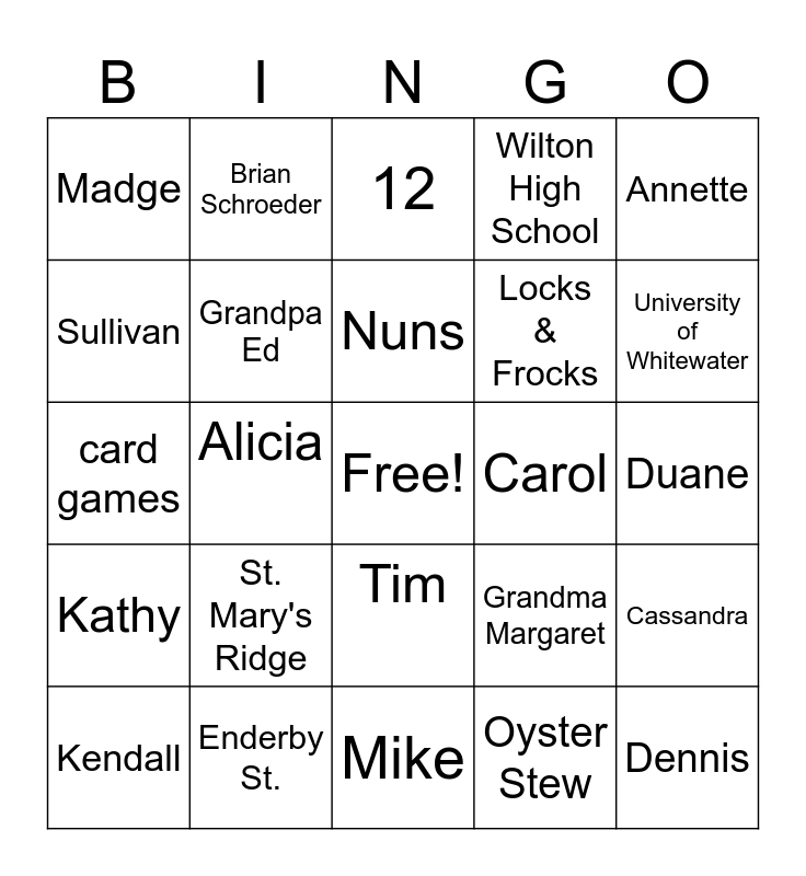 This bingo card has a free space and 39 words: O'Rourke, Jim, Black Valley Homemakers, Grandpa Ed, Kendall, Tim, Nuns, Brookwood High School, Annette, Kathy, Alicia, Wilton High School, Dennis, Duane, Carol, St. Mary's Ridge, Mary, Madge, Pat, Grandma Margaret, Sullivan, Mike, Locks & Frocks, University of Whitewater, Club 71, Pickles, Tobacco, Polka, Barbara Jo, Brian Schroeder, Rose, 1940, 12, Enderby St., Oyster Stew, Teacher, Cassandra, card games and K-Car.
