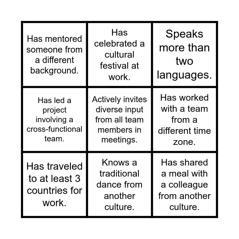 This bingo card has a free space and 8 words: Has worked with a team from a different time zone., Speaks more than two languages., Has celebrated a cultural festival at work., Has traveled to at least 3 countries for work., Has mentored someone from a different background., Has shared a meal with a colleague from another culture., Has led a project involving a cross-functional team. and Knows a traditional dance from another culture..