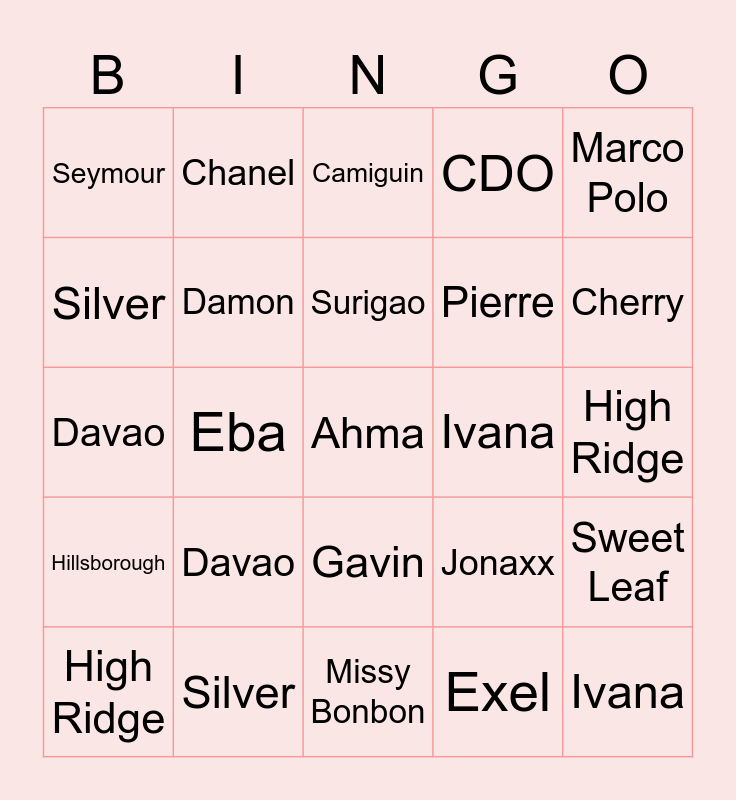 This bingo card has 98 words: Klare, Elijah, Azi, Pierre, Hendrix, Dette, Erin, Hannah, Marichelle, Ricardo, Lorenzo, Helena, Gwen, Cherry, Selena, Damon, Carlitos, Yasmin, Josiah, Justin, Charles, Eba, Knoxx, Jonaxx, Rafael, Chanel, Beatrice, Exel, Vaughn, Eion, Silver, Ahma, Gavin, Ivana, Seymour, Xavier, Camiguin, Dahilayan, Marco Polo, High Ridge, LimketKai, Missy Bonbon, CDO, Sweet Leaf, Hillsborough, Davao, Siargao, Surigao, Stargate, Klare, Elijah, Azi, Pierre, Hendrix, Dette, Erin, Hannah, Marichelle, Ricardo, Lorenzo, Helena, Gwen, Cherry, Selena, Damon, Carlitos, Yasmin, Josiah, Justin, Charles, Eba, Knoxx, Jonaxx, Rafael, Chanel, Beatrice, Exel, Vaughn, Eion, Silver, Ahma, Gavin, Ivana, Seymour, Xavier, Camiguin, Dahilayan, Marco Polo, High Ridge, LimketKai, Missy Bonbon, CDO, Sweet Leaf, Hillsborough, Davao, Siargao, Surigao and Stargate.