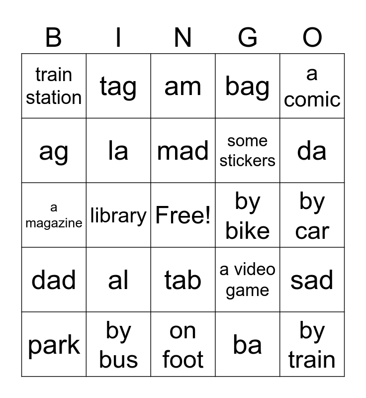 This bingo card has a free space and 29 words: park, mall, library, post office, train station, am, la, al, by bike, by bus, by car, by train, on foot, ba, da, ab, tab, dad, a comic, a magazine, a video game, some candy, some stickers, ag, bag, tag, sad, mad and ma.