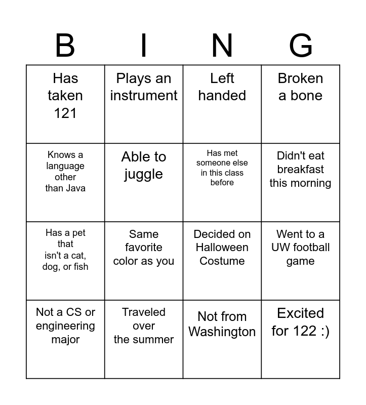 This bingo card has 16 words: Traveled over the summer, Went to a UW football game, Left handed, Has taken 121, Has a pet that isn't a cat, dog, or fish, Plays an instrument, Decided on Halloween Costume, Not from Washington, Knows a language other than Java, Able to juggle, Not a CS or engineering major, Broken a bone, Same favorite color as you, Didn't eat breakfast this morning, Has met someone else in this class before and Excited for 122 :).
