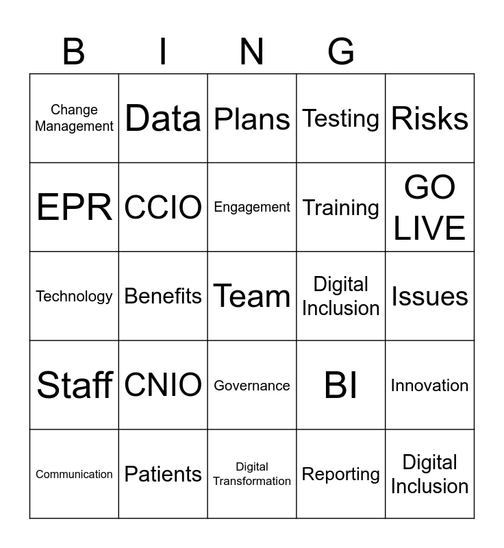 This bingo card has 25 words: CNIO, Digital Transformation, Engagement, Communication, Risks, Change Management, EPR, Data, Digital Inclusion, Governance, Training, Technology, BI, Innovation, CCIO, Digital Inclusion, Issues, Plans, GO LIVE, Benefits, Team, Patients, Staff, Testing and Reporting.