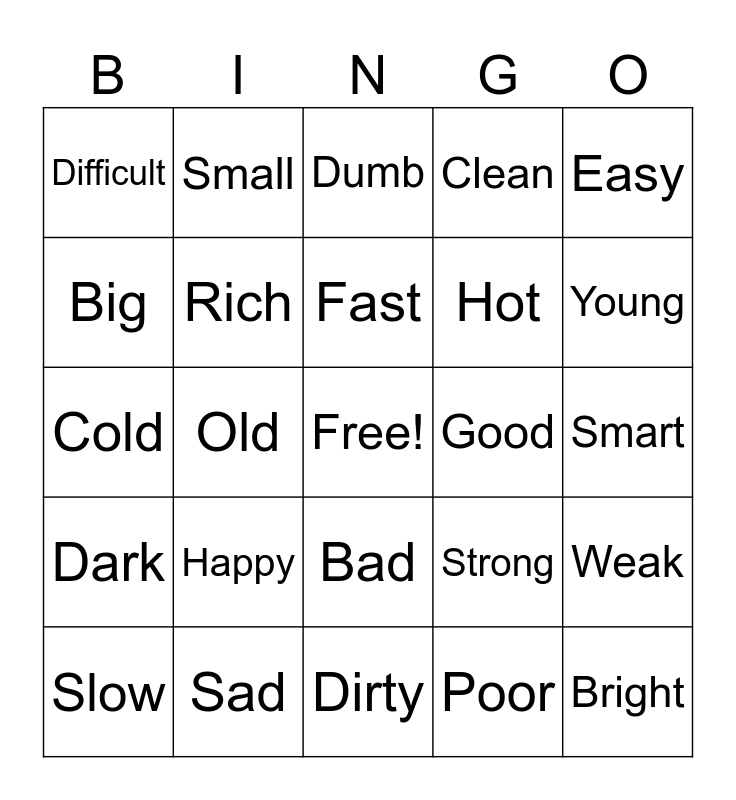 This bingo card has a free space and 24 words: Happy, Sad, Fast, Slow, Easy, Difficult, Big, Small, Good, Bad, Hot, Cold, Strong, Weak, Rich, Poor, Smart, Dumb, Young, Old, Bright, Dark, Clean and Dirty.