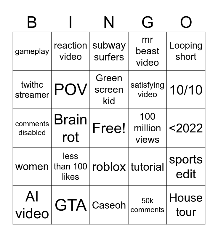 This bingo card has a free space and 24 words: less than 100 likes, GTA, Green screen kid, AI video, Looping short, gameplay, twithc streamer, reaction video, 100 million views, roblox, satisfying video, comments disabled, tutorial, sports edit, POV, 50k comments, <2022, subway surfers, 10/10, Brain rot, House tour, women, mr beast video and Caseoh.