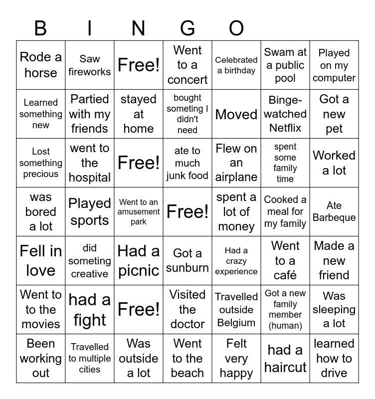 This bingo card has a free space and 48 words: Travelled outside Belgium, Binge-watched Netflix, Went to the beach, Played sports, Free!, Ate Barbeque, Saw fireworks, Travelled to multiple cities, Swam at a public pool, Got a sunburn, Played on my computer, Went to a concert, spent some family time, Flew on an airplane, Went to to the movies, Cooked a meal for my family, Learned something new, Got a new pet, Got a new family member (human), Celebrated a birthday, Moved, Went to an amusement park, Rode a horse, Partied with my friends, Was sleeping a lot, stayed at home, Worked a lot, Been working out, ate to much junk food, went to the hospital, had a haircut, spent a lot of money, Made a new friend, had a fight, was bored a lot, Had a crazy experience, Went to a café, Lost something precious, Had a picnic, Free!, Fell in love, learned how to drive, Free!, Was outside a lot, bought someting I didn't need, Visited the doctor, did someting creative and Felt very happy.