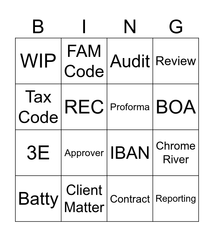 This bingo card has 16 words: Client Matter, Chrome River, Audit, WIP, 3E, FAM Code, IBAN, Contract, Tax Code, REC, Batty, Review, Approver, BOA, Proforma and Reporting.