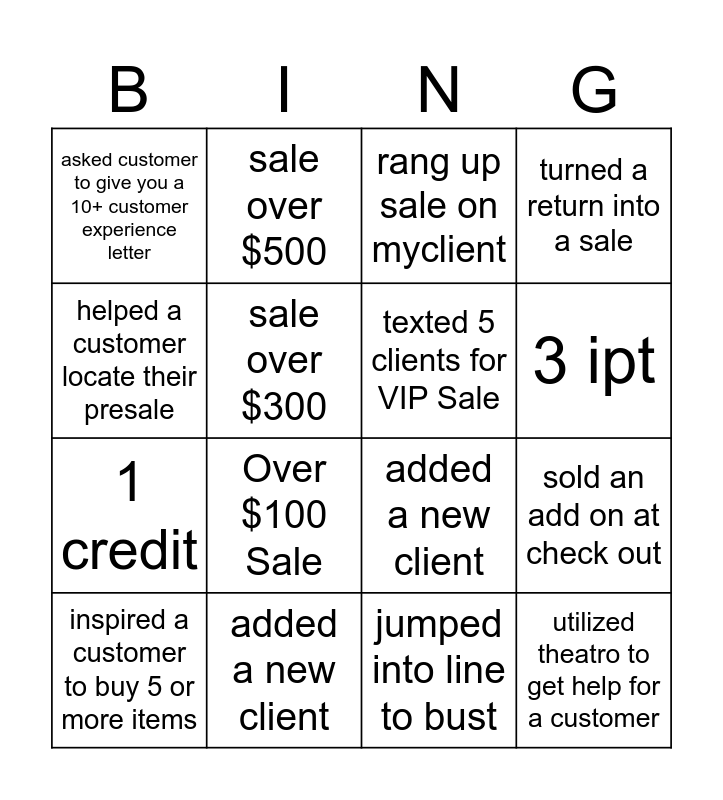 This bingo card has 18 words: Over $100 Sale, utilized theatro to get help for a customer, rang up sale on myclient, asked customer to give you a 10+ customer experience letter, added a new client, turned a return into a sale, inspired a customer to buy 5 or more items, sale over $500, 3 ipt, 1 credit, jumped into line to bust, helped a customer locate their presale, sold an add on at check out, sale over $300, texted 5 clients for VIP Sale, 2 bronze, added a new client and over $300+ sale.
