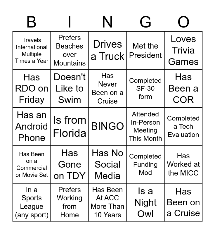 This bingo card has a free space and 24 words: Has Gone on TDY, Prefers Working from Home, Has Never Been on a Cruise, In a Sports League (any sport), Loves Trivia Games, Travels International Multiple Times a Year, Has RDO on Friday, Prefers Beaches over Mountains, Attended In-Person Meeting This Month, Has No Social Media, Completed SF-30 form, Has an Android Phone, Completed Funding Mod, Has Worked at the MICC, Doesn't Like to Swim, Is a Night Owl, Completed a Tech Evaluation, Drives a Truck, Has Been a COR, Is from Florida, Has Been on a Cruise, Has Been on a Commercial or Movie Set, Met the President and Has Been At ACC More Than 10 Years.