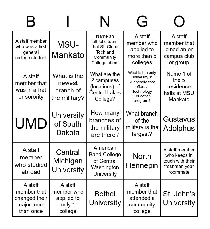 This bingo card has 61 words: What branch of the military uses the slogan “The Few. The Proud.”, A staff member who applied to only 1 college, What was Mr. Kreft’s major his freshman year of college at St. John’s?, A staff member who studied abroad, A staff member that attended a community college, Name the test students take when interested in the military, What is the newest branch of the military?, What is the college that Becker has the most students attend after high school?, What is the only university in Minnesota that offers a Technology Education program?, How many different U of M locations are there in Minnesota?, A staff member who applied to more than 5 colleges, A staff member who had an on campus job or work study job, A staff member that was in a frat or sorority, Name one of the most popular programs at St. Cloud Technical and Community College, A staff member who didn’t take out any loans in college, A staff member who was a first general college student, How many branches of the military are there?, A staff member that joined an on campus club or group, A staff member who was in band, choir or theater in college, What are the 2 campuses (locations) of Central Lakes College?, What branch of the military is the largest?, Name an athletic team that St. Cloud Tech and Community College offers, A staff member that changed their major more than once, A staff member who keeps in touch with their freshman year roommate, A staff member that played intramural sports, Name the placement test students take at St. Cloud Tech and Community College, A staff member who transferred colleges, A staff member who went to college out of state, Name 1 of the 5 residence halls at MSU Mankato, A staff member who majored in something other than education, Name a staff member who has served in a branch of the military, Texas Tech University, St. Cate’s, St. Thomas, MSU- Mankato, Southwest Minnesota State University, St. Cloud State University, University of South Dakota, St. Mary’s University, UMD, Michigan State University, Central Michigan University, Gustavus Adolphus, U of MN Twin Cities, North Hennepin, Bemidji, Augsburg, North Dakota State University, UW- LaCrosse, American Band College of Central Washington University, Bethel University, Concordia Moorhead, St. Olaf College, College of St. Benedict, MSU Moorhead, Concordia St. Paul, Winona, UW Stevens Point, UW River Falls, St. John’s University and Hamline.